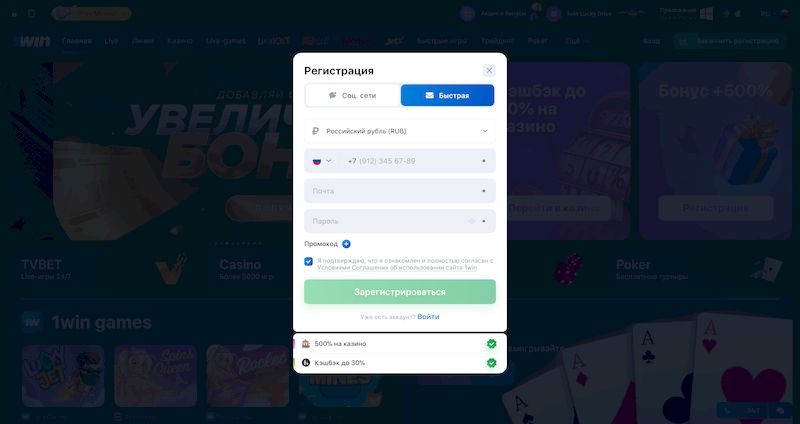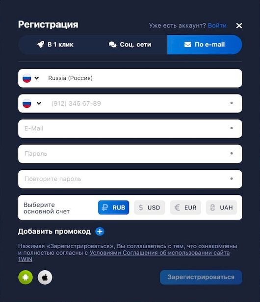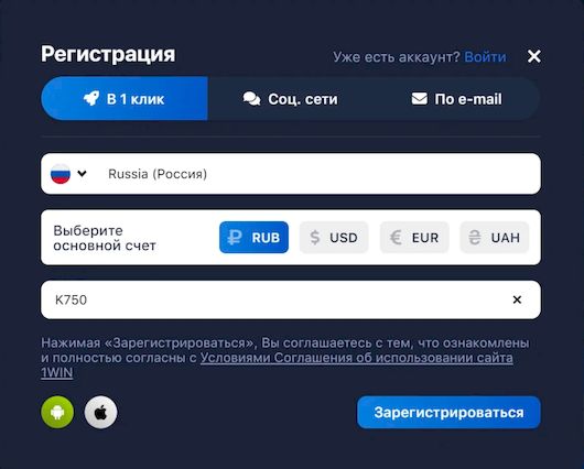 Регистрация на 1Вин в 1 клик